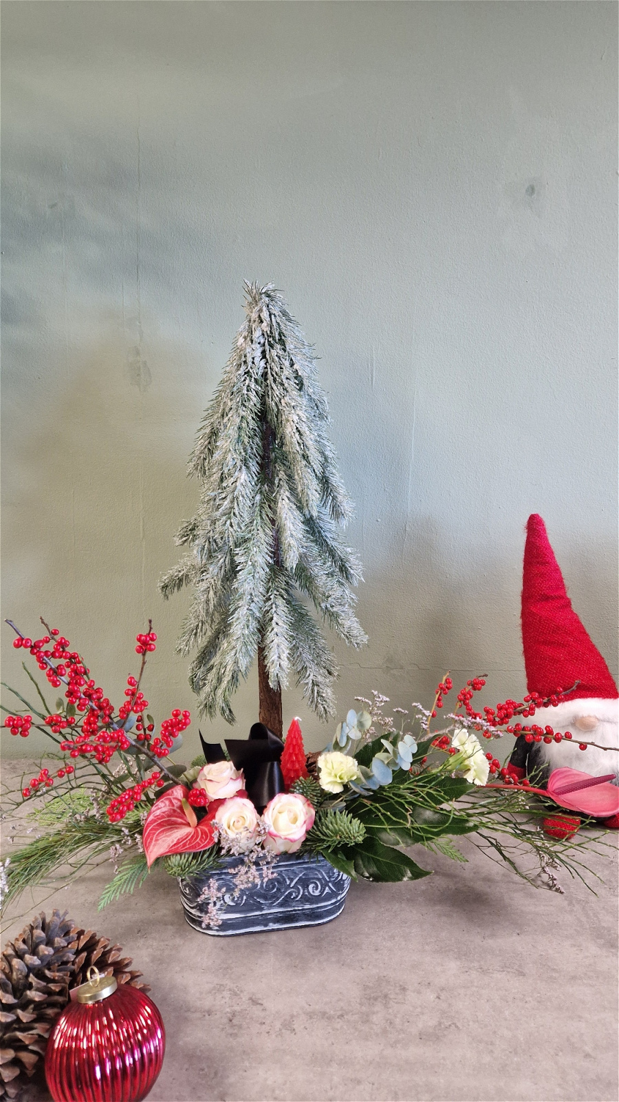 Bring warmth and modern festive style to your table with this striking oblong centrepiece, designed around a beautifully sculpted Christmas tree–shaped candle. Set in a sleek metal container, this arrangement blends contemporary design with rich, traditional seasonal elements.