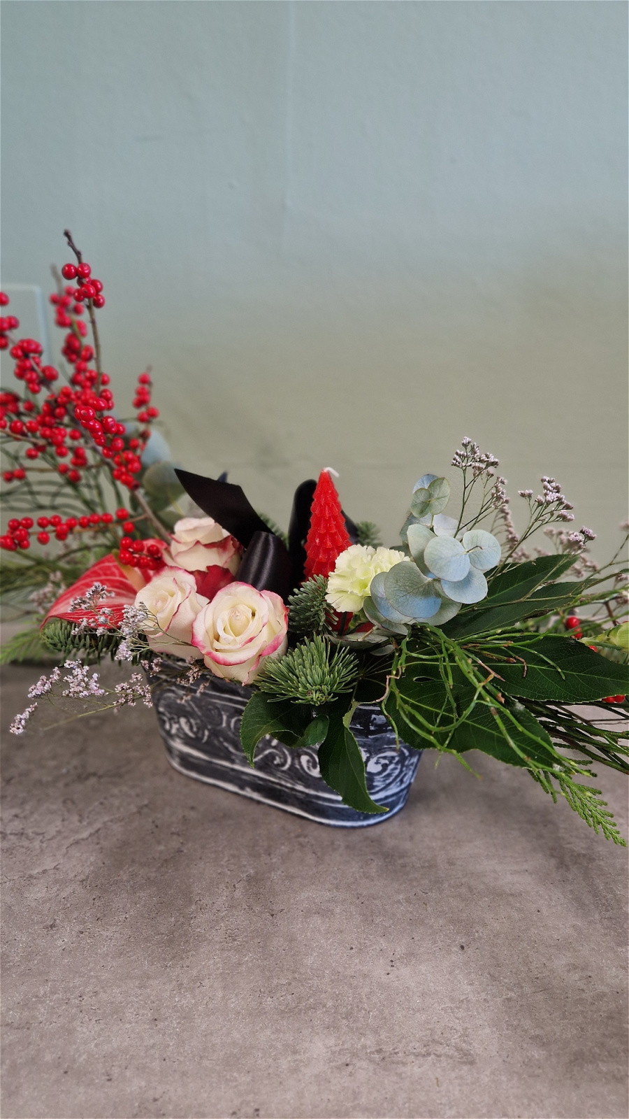 Lush fir and noble foliage form a fragrant, textured base, enhanced with clusters of berries and the deep tones of Heidelbeere. Vibrant roses and striking anthuriums add a luxurious splash of colour, creating a captivating contrast that draws the eye from every angle.