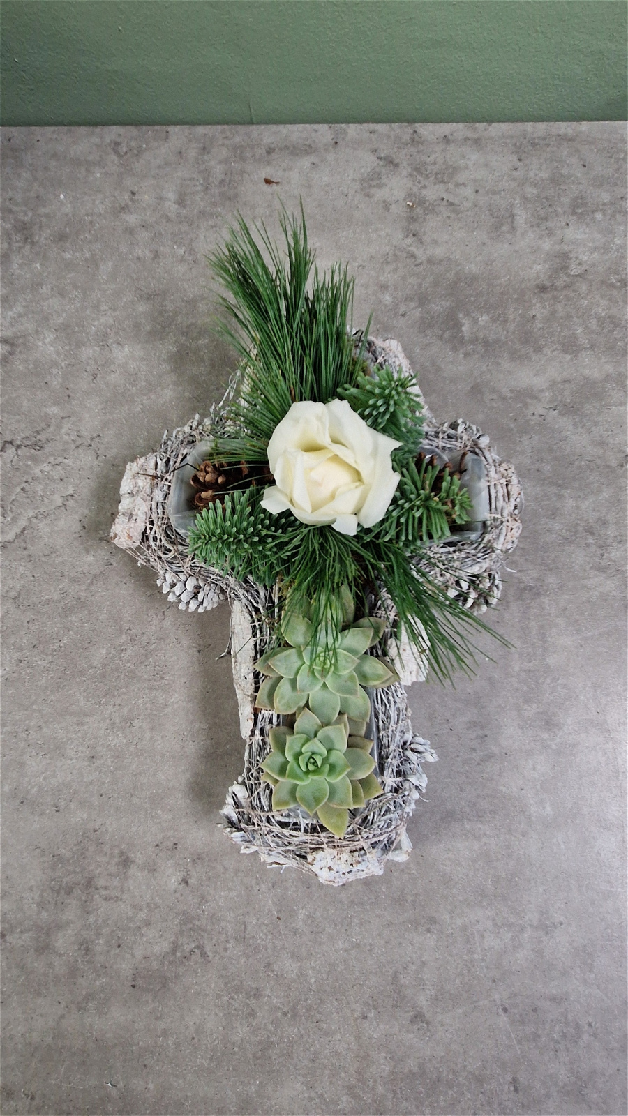 Honor the memory of loved ones with this beautifully crafted grave cross, presented in a textured, hand-woven basket shaped perfectly into a cross. Designed with care and sensitivity, this arrangement blends natural elements and fresh florals to create a peaceful, long-lasting tribute for those we miss at Christmas.