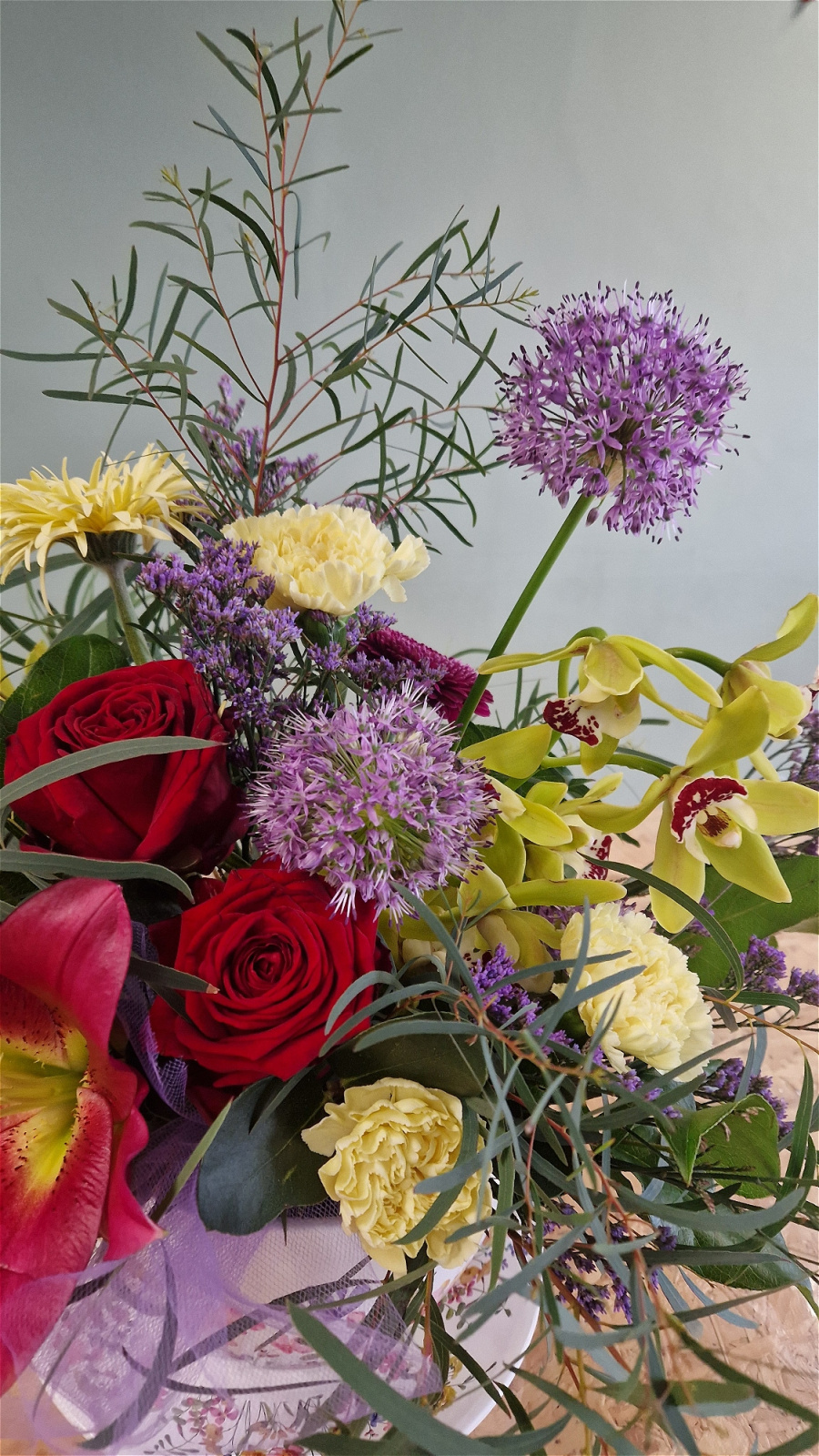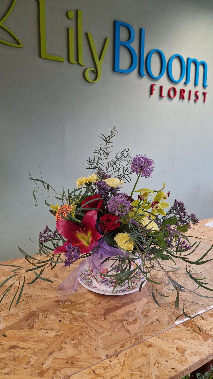 Flowers including stunning Orchids, Red Roses, Alliums, Pom Gerbera, Scented Lilies, flowing foliages, Standards Dianthus, Sea Limonium, set is a Tea cup with painted spring flowers and Saucer.