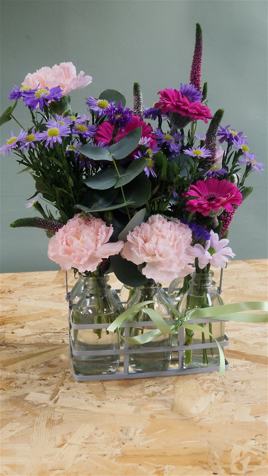 A charming carry pack featuring six little glass bottles, each filled with fresh, handpicked flowers,  perfect for spreading small moments of beauty and joy.